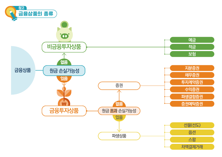 즉, 투자한 원금의 손실가능성이 있는 금융상품을 금융투자상품이라고 한다. 이러한 금융투자상품은 원금의 초과손실 가능성 여부에 따라 증권과 파생상품으로 구분된다.